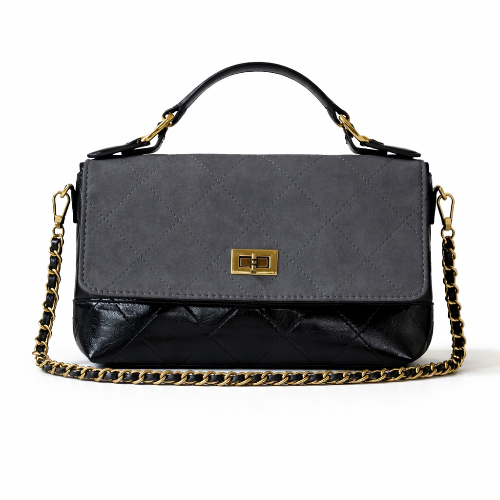 Seu visual bicolor em cinza e preto cria um contraste refinado e versátil, enquanto os metais dourados adicionam um toque de luxo ao modelo. Uma peça pensada para mulheres que valorizam estilo, praticidade e presença.