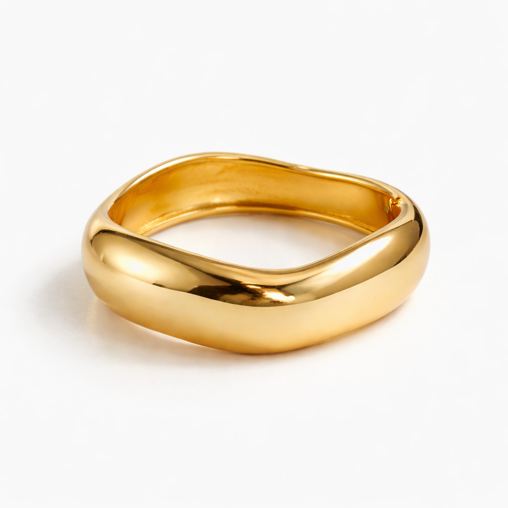 Com acabamento dourado polido e superfície suave, o bracelete reflete a luz de forma elegante, tornando-se um destaque na composição do look. Seu design minimalista permite combinar facilmente com outros acessórios, criando produções modernas e sofisticadas.
