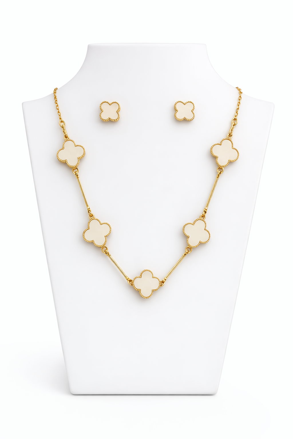 O colar possui trevos distribuídos ao longo da corrente, criando um visual elegante e moderno. Os brincos complementam o conjunto com o mesmo design delicado, formando um kit harmonioso que valoriza o look com sutileza e sofisticação.
