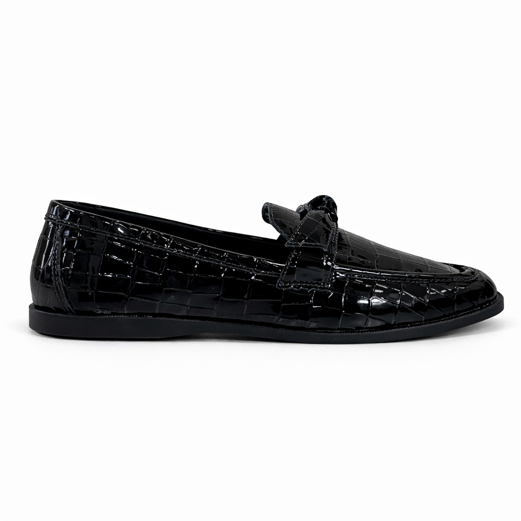 Os mocassins seguem em alta por unirem conforto, elegância e praticidade na rotina feminina. A textura croco com brilho sutil do verniz adiciona informação de moda ao look, enquanto o preto mantém a proposta clássica e sofisticada que nunca sai de cena.