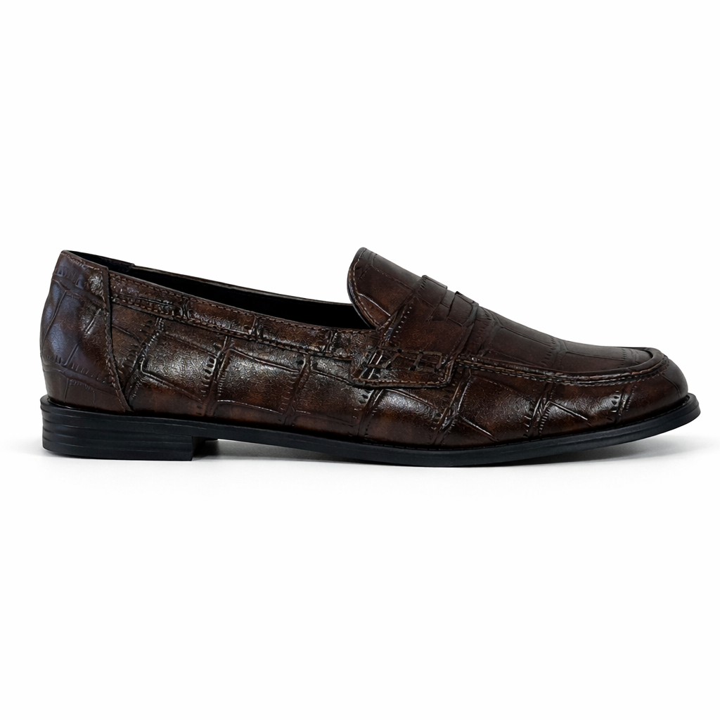 Os mocassins seguem como um dos principais destaques do guarda-roupa feminino, trazendo uma proposta elegante e funcional. A textura croco reforça o visual sofisticado e aparece como tendência nas produções mais refinadas.