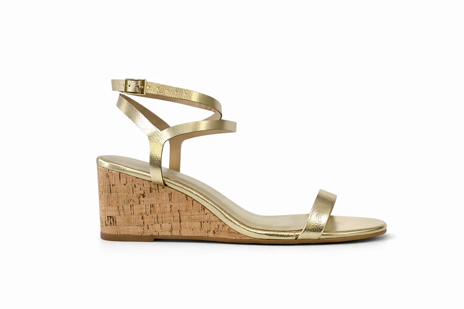 A Sandália Anabela Gisele – Ouro Light é aquele modelo que ilumina qualquer produção com elegância e leveza. O acabamento metálico suave, combinado ao salto de cortiça natural, cria uma estética moderna, fresca e super versátil para o dia e para a noite ✨.