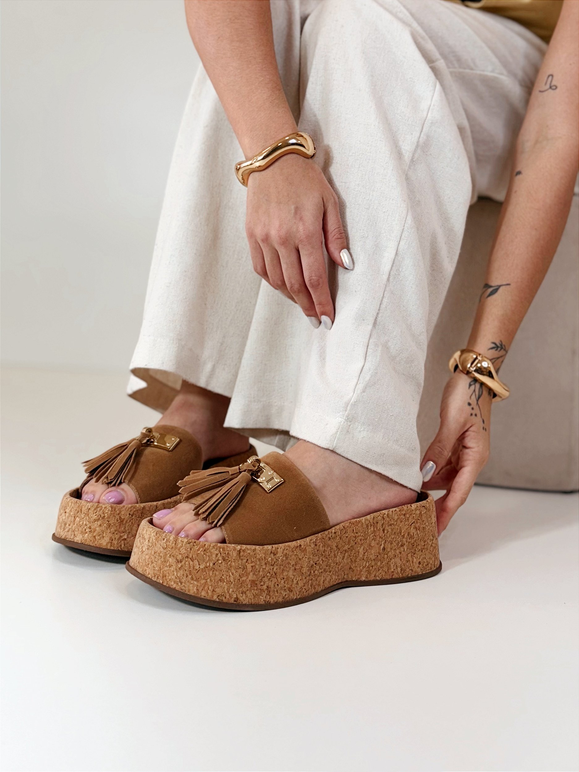 O Tamanco Feminino Bárbara é a escolha certa para quem deseja unir conforto, modernidade e sofisticação. Na cor caramelo, com base em cortiça e detalhe de tassel com peça dourada, ele entrega um visual único que transita entre o casual chic e o elegante.
